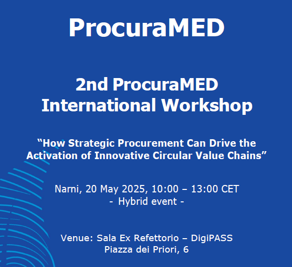 We are pleased to invite you to the 2nd ProcuraMED international workshop “How Strategic Procurement Can Drive the Activation of Innovative Circular Value Chains”, to be held on Tuesday, 20 May 2025, in Narni, from 10:00 to 13:00 CET.