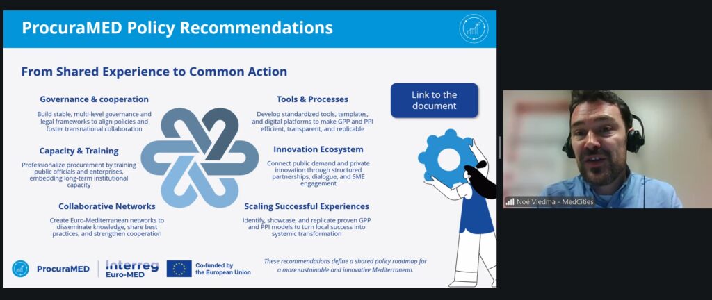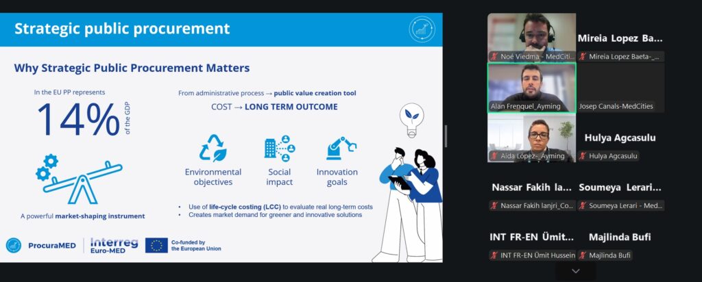 MedCities organised a capitalisation webinar of the ProcuraMED project on 16 December, bringing together Mediterranean local authorities to strengthen their capacity in Green Public Procurement (GPP) and Public Procurement of Innovation (PPI). ProcuraMED is an Interreg EURO-MED initiative that promotes more sustainable, strategic and innovation-driven procurement systems across the region.