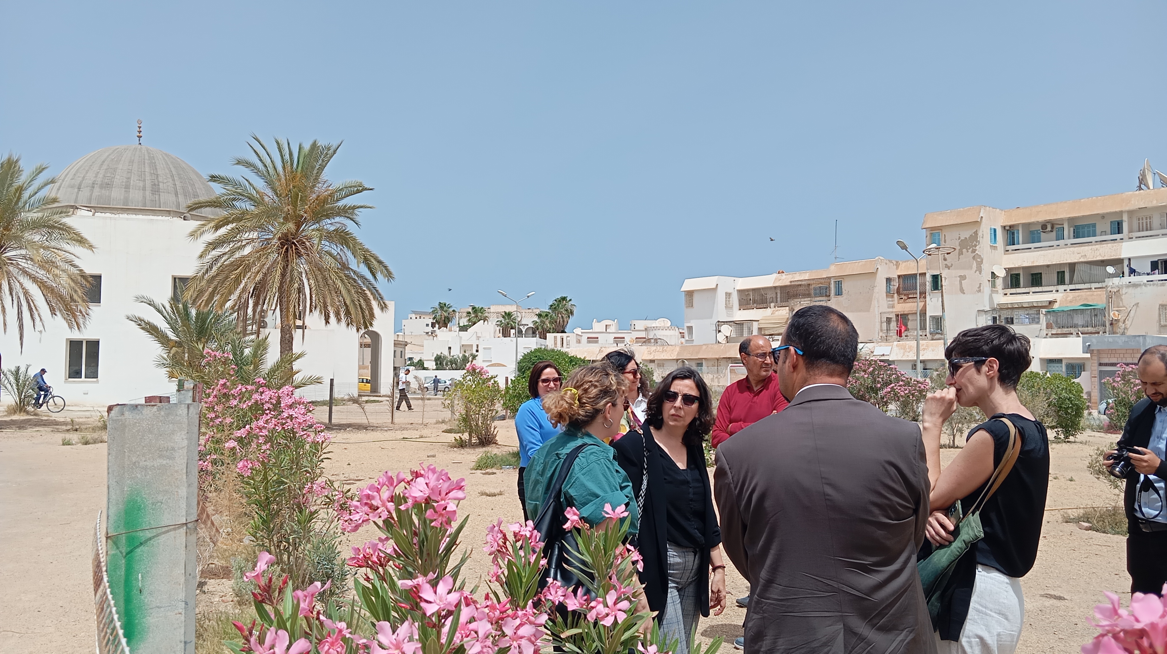 La visite a comporté une journée complète d’échanges, avec la présentation des objectifs du projet, de son calendrier, de la méthodologie adoptée ainsi que des activités à venir. Une partie essentielle de la mission a porté sur les deux axes principaux du projet à cette étape : la mise en œuvre du diagnostic participatif, et les stratégies possibles pour mobiliser les parties prenantes et les citoyens. Lors de la session, les critères de sélection du site ont été présentés, et le rôle des acteurs locaux dans la conception d’espaces verts adaptés aux besoins de la communauté a été discuté. Afin de mieux comprendre le contexte et le potentiel des zones d’intervention, deux sites ont été visités à Gabès. Le site sélectionné présente un fort potentiel d’impact social, compte tenu de son emplacement socialement stratégique à proximité de l’une des principales mosquées de la ville, et de sa proximité avec des institutions clés telles que la bibliothèque publique et le Centre universitaire d’activités culturelles et sportives de Gabès.